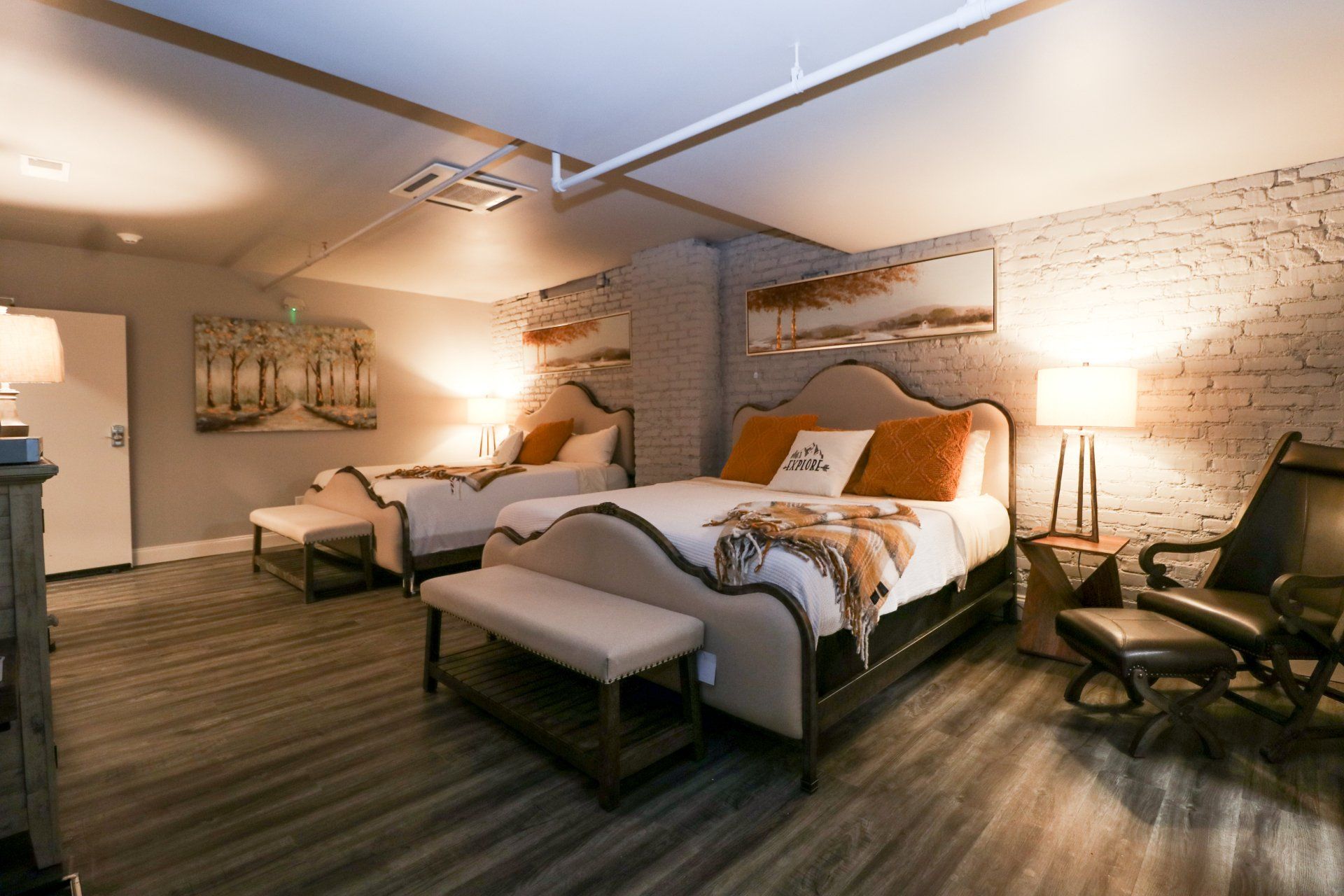 While maintaining the distinct character of this historic building, our recent renovations included upgrades that create the homey feel and Southern charm that makes our hotel your “home away from home.” You can choose between a luxurious King/Queen or Queen/Queen bed combo, both of which are complete with plush latex mattresses, lavish furnishings and bedding, and state of the art showers, all steeping you in relaxation. Each room is also equipped with 65” flat screen televisions with all your favorite channels, allowing you to kick back and fully embrace a cozy escape.